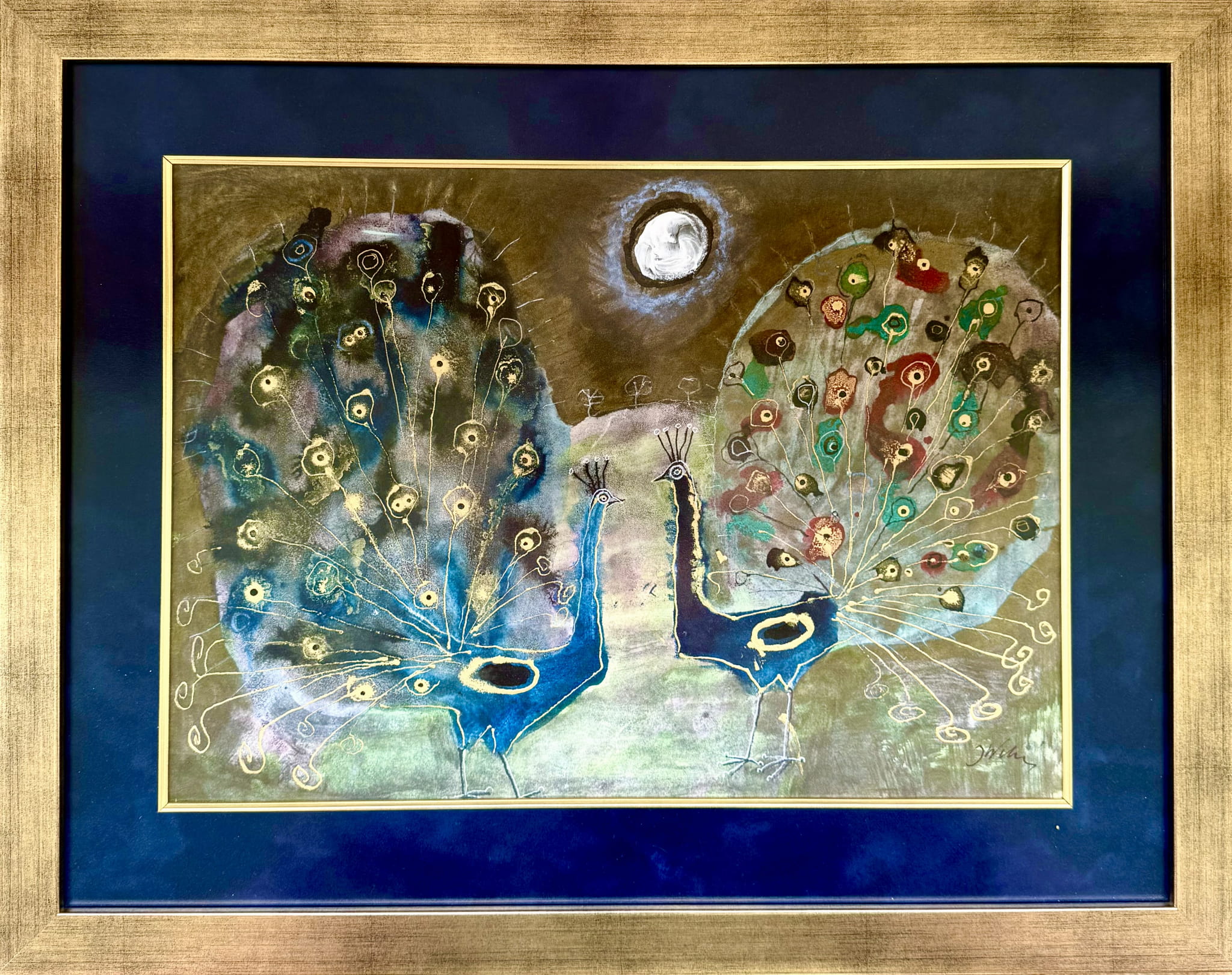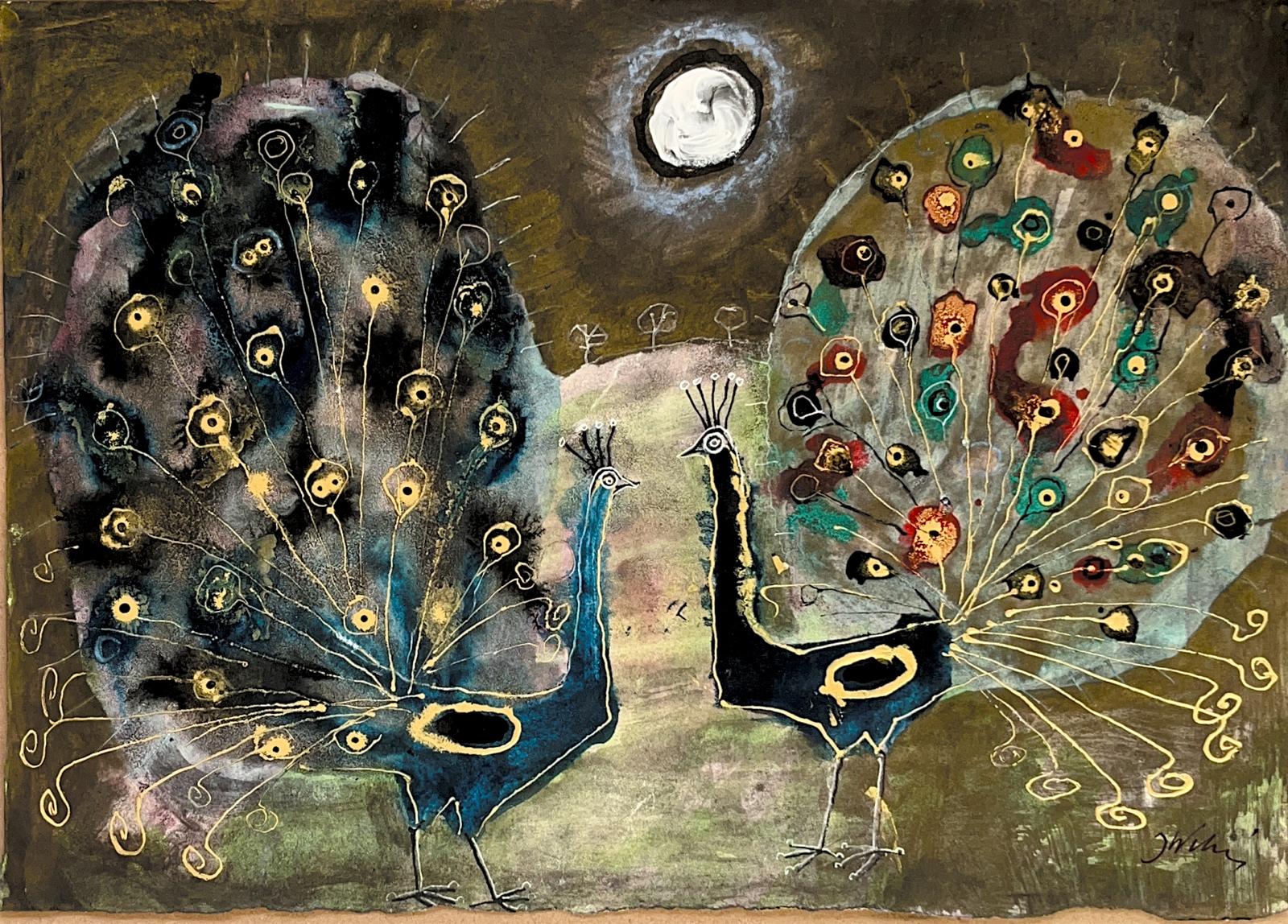 Gouache painting, watercolor on paper, „Na mazowieckiej łące (in the Masovian meadow"", Józef Wilkoń, 35 x 48,5 cm, modern art, birds, peacocks